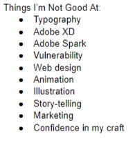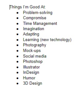 For the first part of this week's workshop challenge, I started by making a list of skills I'm good at, as well as a list of things that I'm not as well-versed with. The world of design includes a variety of different skills to be gained, so while these lists are long, they are by no means all-inclusive.